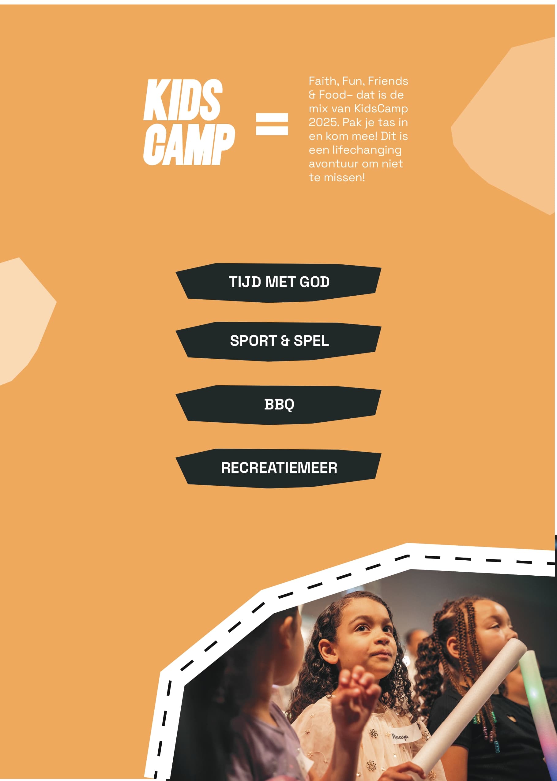 KidsCamp is de plek waar je o.a. nieuwe vrienden maakt, samen leert en groeit in je geloof en identiteit in Christus. Het is een midweek gevuld met Faith, Fun, Friends & Food en tegelijkertijd ontdekken we steeds meer hoe kostbaar we zijn in Gods ogen.
