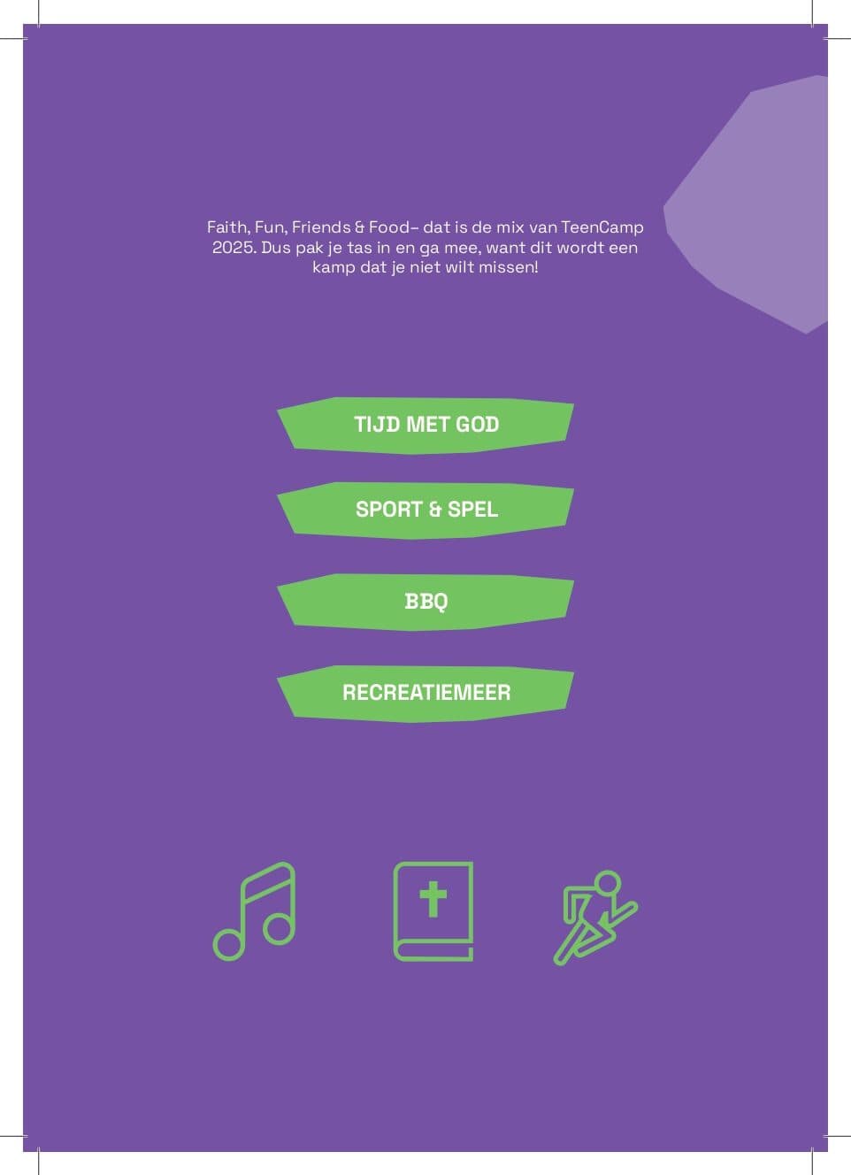 Faith, Fun, Friends & Food is de mix van TeenCamp 2025. Dus pak je tas in en ga mee, want dit wordt een kamp dat je niet wilt missen!